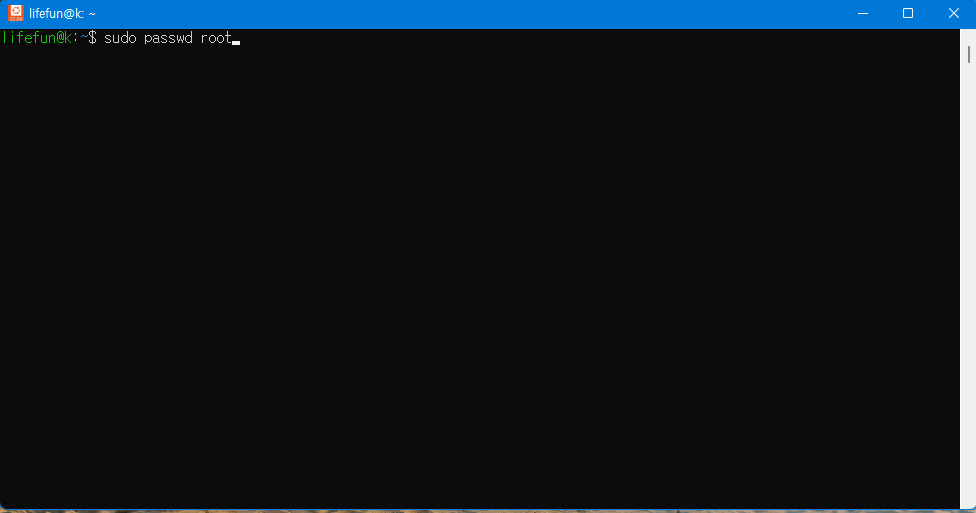 아래 명령어로 root 비밀번호르 설정합니다. 앞서 설정한 계정은 사용자 초기 계정이며 root 계정은 설정이 되지 않은 상태입니다. 원활한 실행을 위해서는 root 비밀번호를 설정합니다.