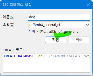 예제 실습을 위하여 dev 데이터베이스를 생성합니다. 데이터베이스를 dev로 생성을 하고, 조합은 utfmb4_general_ci를 선택해 주고 확인 버튼을 누릅니다.