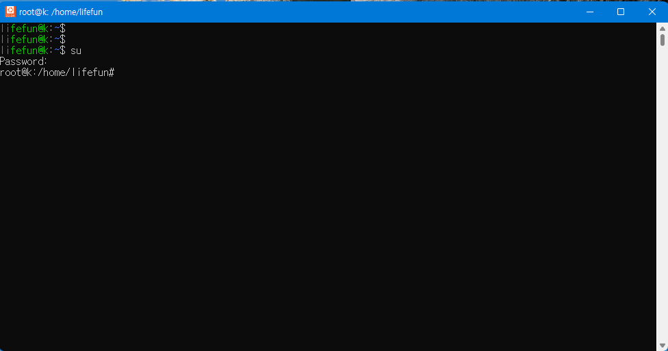 root 비밀번호를 설정을 하였다면, su 명령어로 로그인을 시도하여 확인합니다.