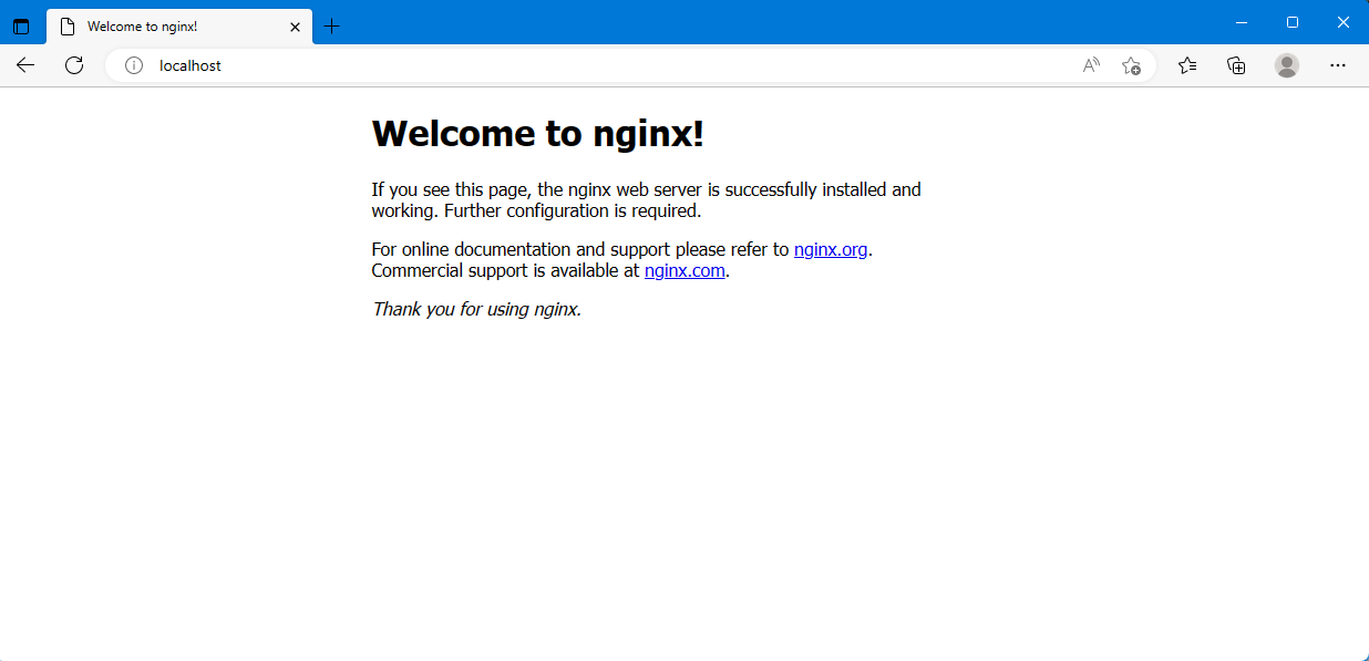 nginx 서비스가 정상적으로 실행이 되었다면 아래와 같은 화면이 나타납니다. 확인은 웹 브라우저 화면 주소창에 localhost 입력 후 확인 합니다.