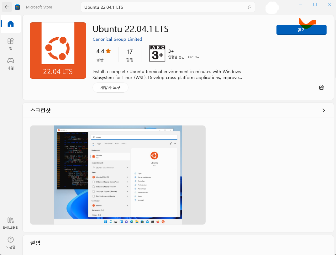 Microsoft Store를 실행하시고 Ubuntu 22.04.1 LTS를 다운로드합니다.