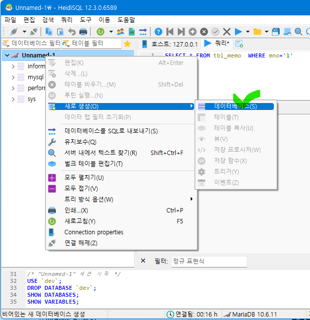 HeidiSQL 쿼리탭에 사용자 생성 쿼리를 작정하여 쿼리 실행 버튼을 클릭 합니다.
