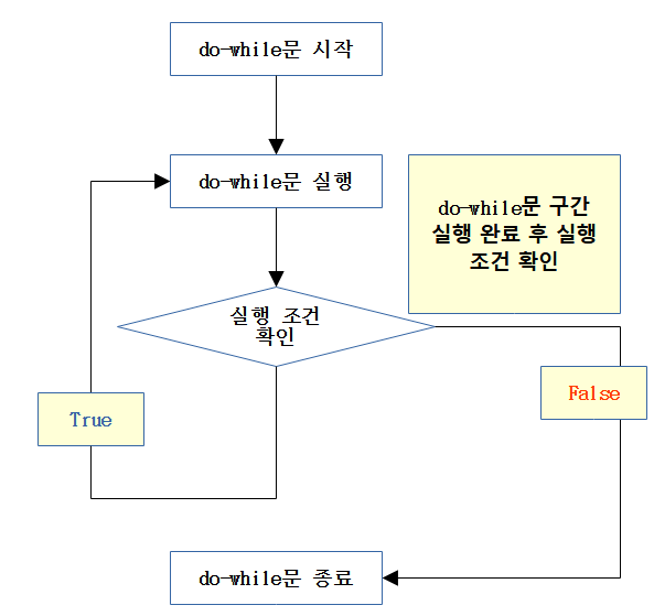 do while문은 while문과 유사하지만 한 가지 차이점이 있습니다. while문은 영역 내 구문을 실행하기 위해서 조건을 먼저 비교를 합니다. 하지만 do while문은 조건 만족 여부 상관 없이 영역 내 구문을 처음 한번 실행을 하고, 다음 반복 회차부터 조건을 비교합니다.