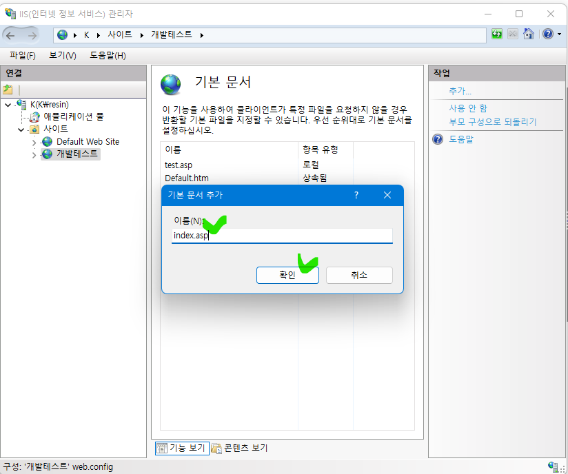 4. 추가 메뉴를 클릭하면 아래 그림과 같이 [기본 문서 추가]팝업창이 나타납니다. 이름 입력란에 추가할 페이지 파일명을 입력하시고 확인 버튼을 누르면 완료됩니다.