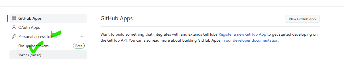 3. Developer settings 화면에서 좌측 메뉴에 [Personal access tokens > Tokens(classic)]을 클릭합니다.