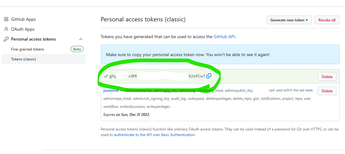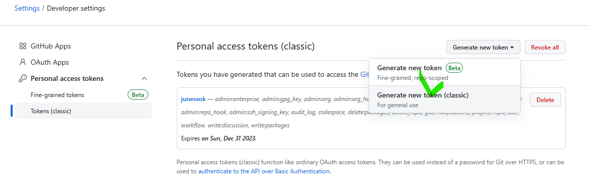4. [Generate new token] 선택 박스를 선택 하시면 아래 그림과 같이 선택 화면이 나오는데 [Generate new token(classic)]을 선택합니다.
