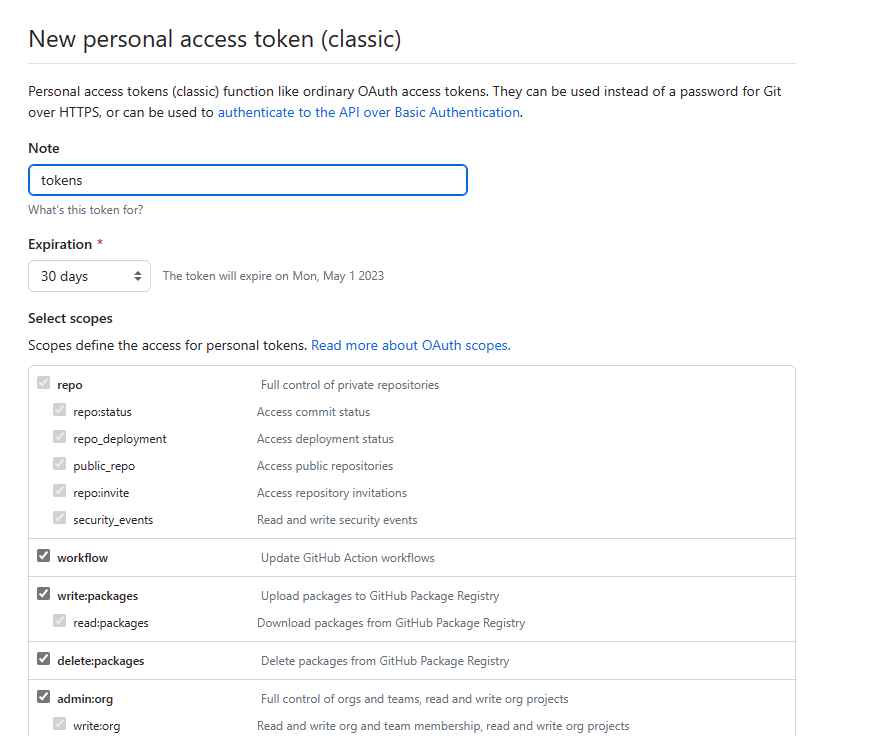 5. Note란에는 적절하게 토큰명을 입력하시고, Select scopes 체크란에는 해당 토큰에 대한 접근 범위에 대해서 체크하는 영역인데 자신의 상황에 맞게 접근 범위에 대해서 선택하시면 됩니다. 만료일(Expiration)은 기본 30일입니다. 이것도 자신의 상황에 맞게 선택해 주시면 됩니다.