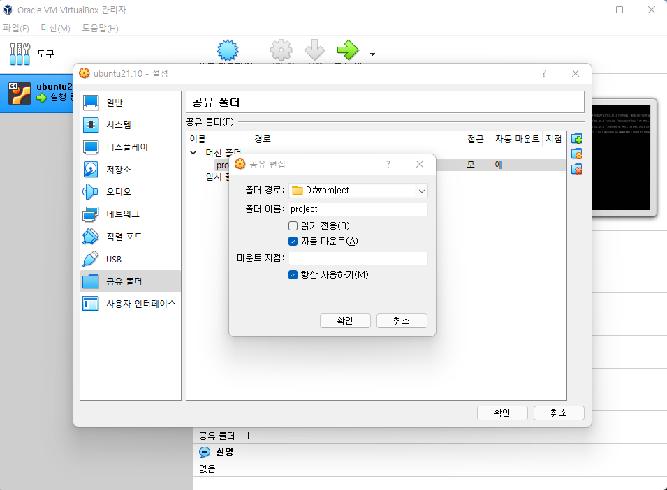sudo mount -t vboxsf [공유폴더에 설정한 폴더이름] [ubuntu mount 경로]
