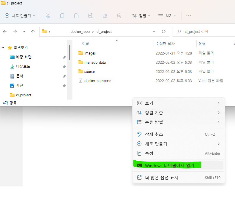 해당 폴더에서 오른쪽 마우스 클릭을 하면 아래와 같은 팝업 메뉴가 나타나며