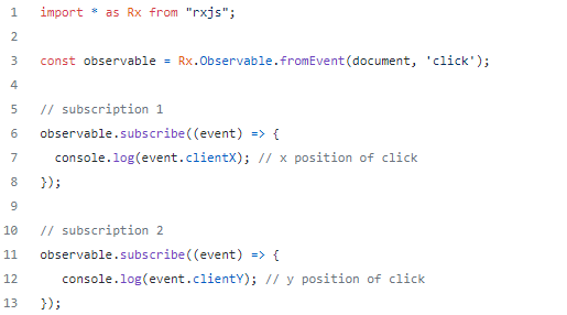 콜드 옵저버블이 내부에 의해 생성된다는 의미는 데이터베이스나 웹 요청 url에서 읽는 방식을 말하며, 핫 옵저버블의 외부에서 발생된다는 의미는 이벤트 행위에 발생되는 방식을 말합니다. 그리고 핫 옵저버블은 여러 옵저버 간에 데이터를 공유할 수 있습니다. 이러한 동작을 멀티캐스팅이라고 합니다. 이벤트 발생 방식이기 때문에 옵저버블에 옵저버가 등록이 전혀 없어도 데이터는 생성됩니다. 하지만 등록되어 있는 옵저버가 없기 때문에 데이터는 손실이 됩니다.